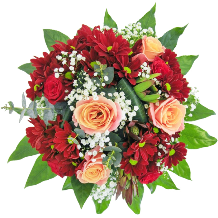 Discover elegance at its finest with our premium flower arrangement. This bouquet features a vibrant mix of sweet peach roses and scarlet roses, enriched by deep red spray chrysanthemums and delicately accented with white gypsophila, aralia, and eucalyptus leaves. Hand-picked from the freshest collections, each bloom guarantees up to 5 days of impeccable beauty.